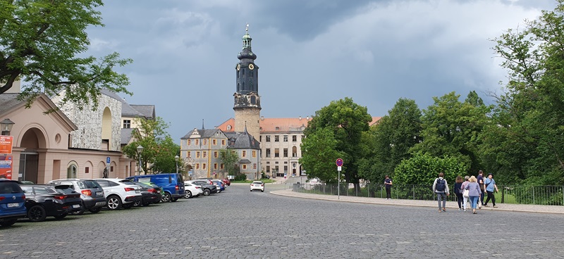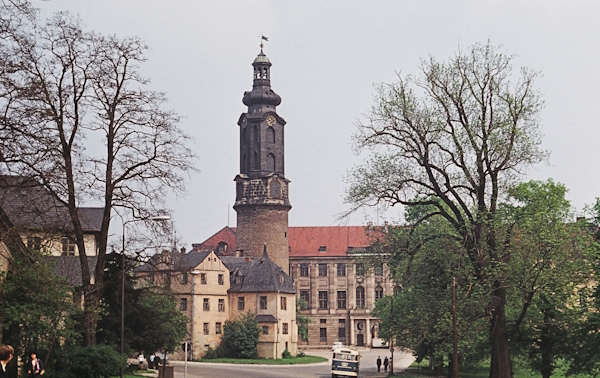 Am Horizont in der Mitte schwach zu sehen der Glockenturm der KZ-Gedenkstätte Buchenwald, 1958 eingeweiht.