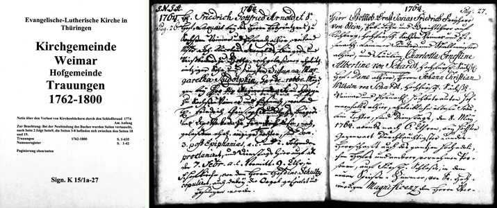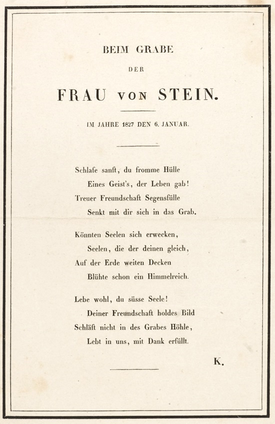 weil. [weiland] Herrn Gottlob Ernst Josias Friedrich Freyherr v. Stein, Erbliche u Gerichtsherrens auf Kochberg u Großherzogl. S. [Großherzoglich Sächsischer] Oberstallmeisters allh. nachgel. [allhier nachgelassene] Frau Witwe