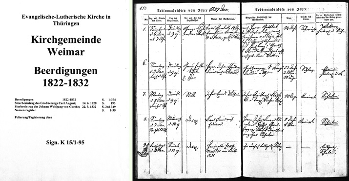 (Archiv und Bibliothek der Evangelischen Kirche in Mitteldeutschland, Standort Eisenach: Kirchgemeinde Weimar, Beerdigungen 1822-1832, Signatur K15/1-95, S. 152. Abbildungen: Archion Kirchenbuchportal GmbH Stuttgart; Bild 1 = Titelseite, Bild 176 = Seite 152)