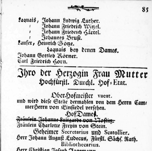 Da wird eine 15-jährige niederen und nicht uralten Adelsgeschlechts – und damit eigentlich gegen die geltenden Voraussetzungen – Hofdame bei Anna Amalia. Der Ausgleich für den entlassenen Vater (bis dato Hofmarschall in Weimar) dürfte nicht der einzige Grund gewesen sein.