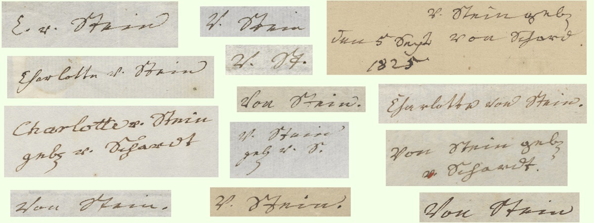 Innerhalb dieser Uneinheitlichkeit hatte Charlotte v. Stein wenigstens noch eine recht saubere Handschrift, was man z. B. bei Goethe eher nicht behaupten kann.